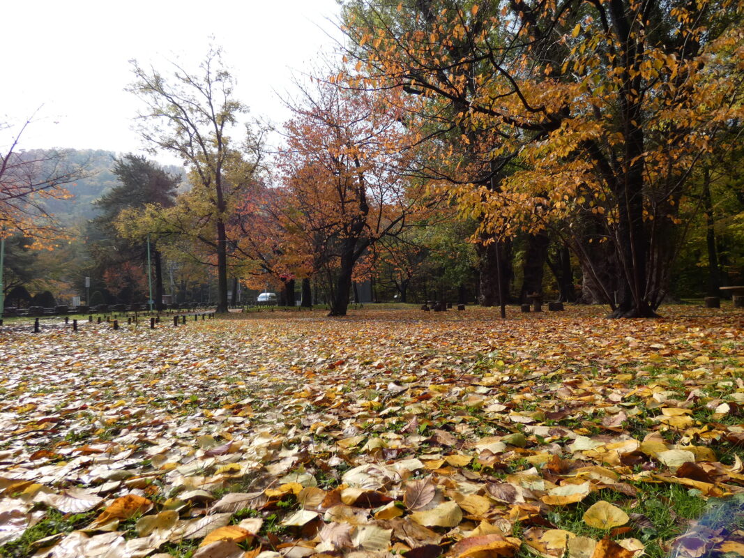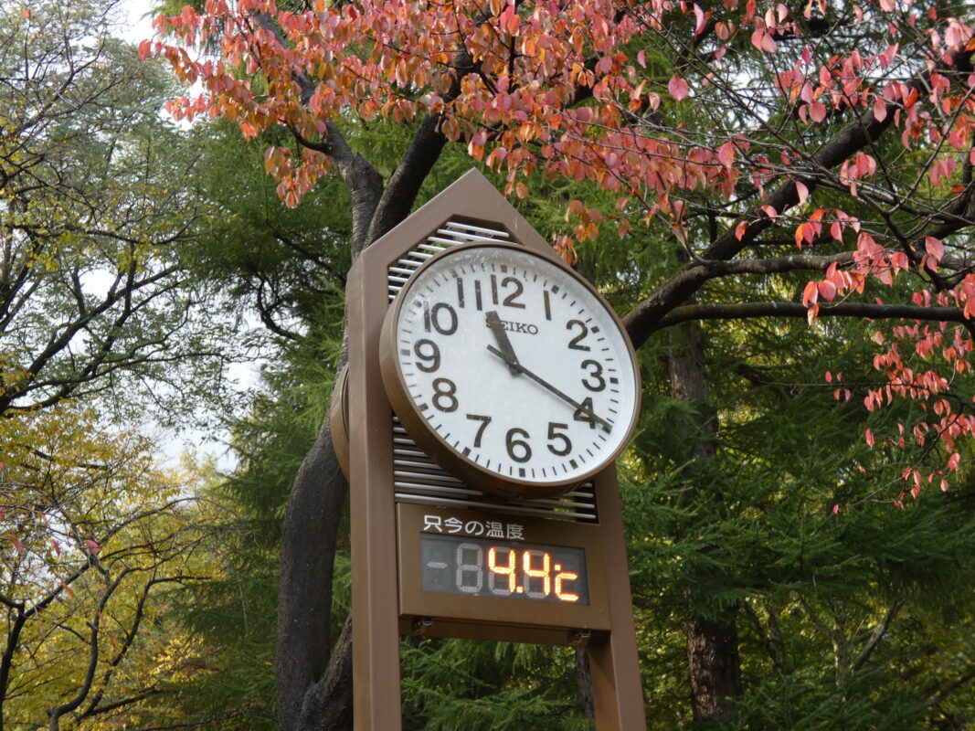 紅葉情報 2025年10月28日の円山公園の紅葉の様子です。 今日午前11時20分の気温です。 円山公園ではパラパラと雪が降っています。 紅葉状況は、園内全体でみると6~7割程度です。 落ち葉の量も多くなってきました。 気温が低い日が続いているので外出の際は防寒対策をし、風邪にお気を付けください。