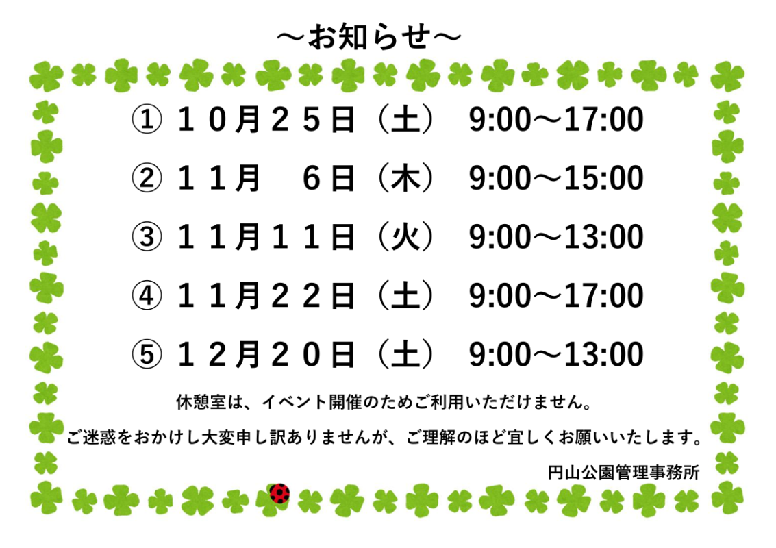 円山公園パークセンターからのお知らせ 日頃より円山公園をご利用いただき、ありがとうございます。 円山公園パークセンター内の休憩室は、下記の日時、ご利用いただけません。 なお、受付窓口は、通常どおり営業しております。 ご迷惑をおかけし、大変申し訳ありませんが、ご理解のほど、よろしくお願いいたします。